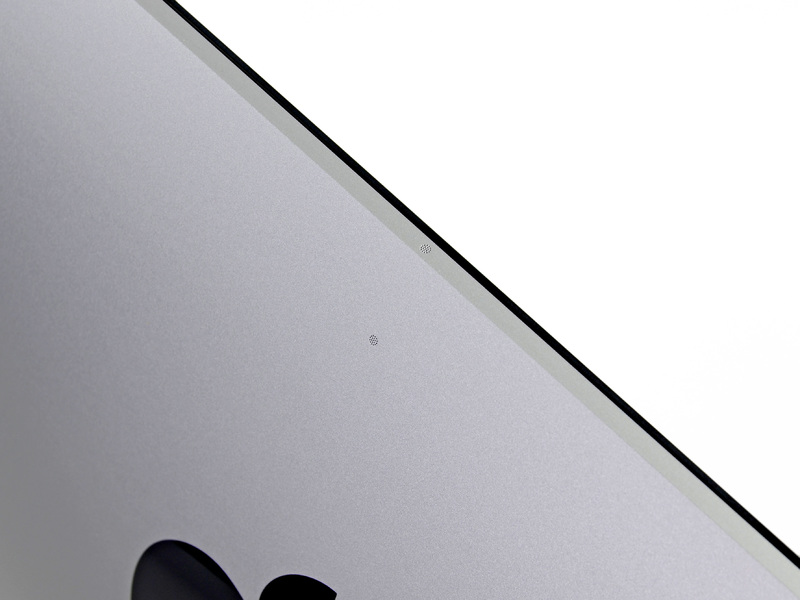 - Hiding above the Apple logo, we find the small dual microphone grates.